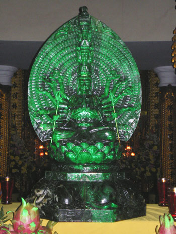 Tượng Phật Ngọc Quan Âm nặng 285kg, có chiều cao 1m15, được các nghệ nhân Thái Lan tạc vô cùng khóe léo, tinh xảo từ các khối ngọc và mảnh ngọc có trọng lượng khoảng 1,2 tấn. Bảo tượng là hình ảnh Phật Bà trong tư thế “kiết già hàng ma” thiền định trên tòa sen, với 18 cánh tay bố trí cân đối hai bên với nhau nhiều tư thế khác nhau rất sống động (niệm chú, cầm bình bát, pháp khí khác…). Trong đó, có 14 cánh tay rời, chạm khắc tinh tế được gắn vào hai bên thân tượng, với độ mở rộng của đôi tay từ 0,4-0,6m. Phật ngọc quay ra bốn phương, trên đỉnh có tượng Phật A Di Đà tĩnh tọa mang ý nghĩa “Thập nhất diện Quan Âm”. Sau lưng bảo tượng là vầng hào quang ngọc có hình lá bồ đề, trên đó là những bàn tay ngọc có mắt Phật (Thiên Thủ Thiên Nhãn).