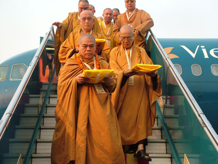 Nhanh hơn buổi sáng, sau thời gian kỷ lục hơn 12 tiếng hành trình đi về, đúng 16g35, máy bay đáp về sân bay Nội Bài, hoàn thành xuất sắc chuyến cung nghinh 3 bảo tháp xá lợi Phật từ Ấn Độ.