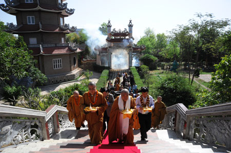 Vừa đọc kinh vừa rước xá lợi Phật vào tháp Đại giác ngộ làm lễ (Ảnh: Võ Văn Tường)