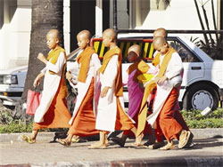 | Không khí đang bình bình lặng lặng, bỗng đâu một đám rước trang trọng tiến đến. Lát sau lại đám nữa. Ra là lễ xuất gia của một tiểu đồng. Đoàn người rồng rắn, hân hoan, cắp chăn chiếu, vật dụng cá nhân, đưa rước một chú bé ăn vận rực rỡ có lọng che. Chú nở nụ cười ngây thơ và kiêu hãnh. Ở đất nước Phật giáo này, xuất gia đúng là niềm kiêu hãnh của mỗi gia đình. Nhà có người xuất gia thì kể như danh giá. 5 tuổi, chú bé được gửi vào chùa, sáng dậy từ 4 giờ đi khất thực. 11giờ mới được ăn bữa chính, nhịn cho đến tận sáng hôm sau. |