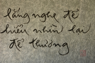 “Lắng nghe để hiểu. Nhìn lại để thương” Đó là câu thư pháp mà Sư Ông Làng Mai đã từng gửi đi vào đầu một mùa Xuân. Câu thư pháp đó, như những cánh chim bồ câu trắng, đã cùng với đất trời mùa Xuân, đem an ủi và tin yêu tới biết bao trái tim buồn khổ. Nếu đã biết “Lắng nghe để hiểu”, sẽ biết “Nhìn lại để thương”, từ đấy, chúng ta mới có thể cho nhau những gì đích thực đang cần thiết.
