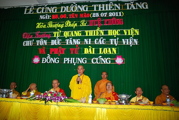 Ngày 25/06/Tân Mão (25/07/2011) Hòa thượng Pháp sư Huệ Không – Viện trưởng Từ Quang Thiền Học viện cùng chư Tôn đức Tăng – Ni các tự viện và chư Phật tử tại Đài Loan từ xa ngàn dặm đã lân mẫn chấn tích quang lâm Vạn Phật Quang Đại Tòng Lâm Tự tổ chức lễ cúng dường Thiên Tăng nhân mùa An cư kiết hạ PL. 2555- DL.2011.